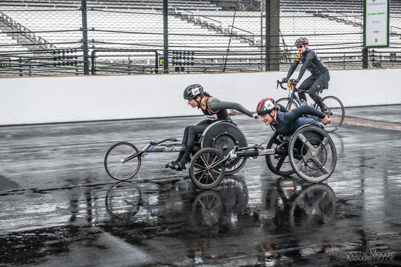 Participants enjoy their lap around the Indianapolis Motor Speedway despite the rain during the Annual OneAmerica 500 Festival Mini-Marathon on Saturday, May 4, 2019.