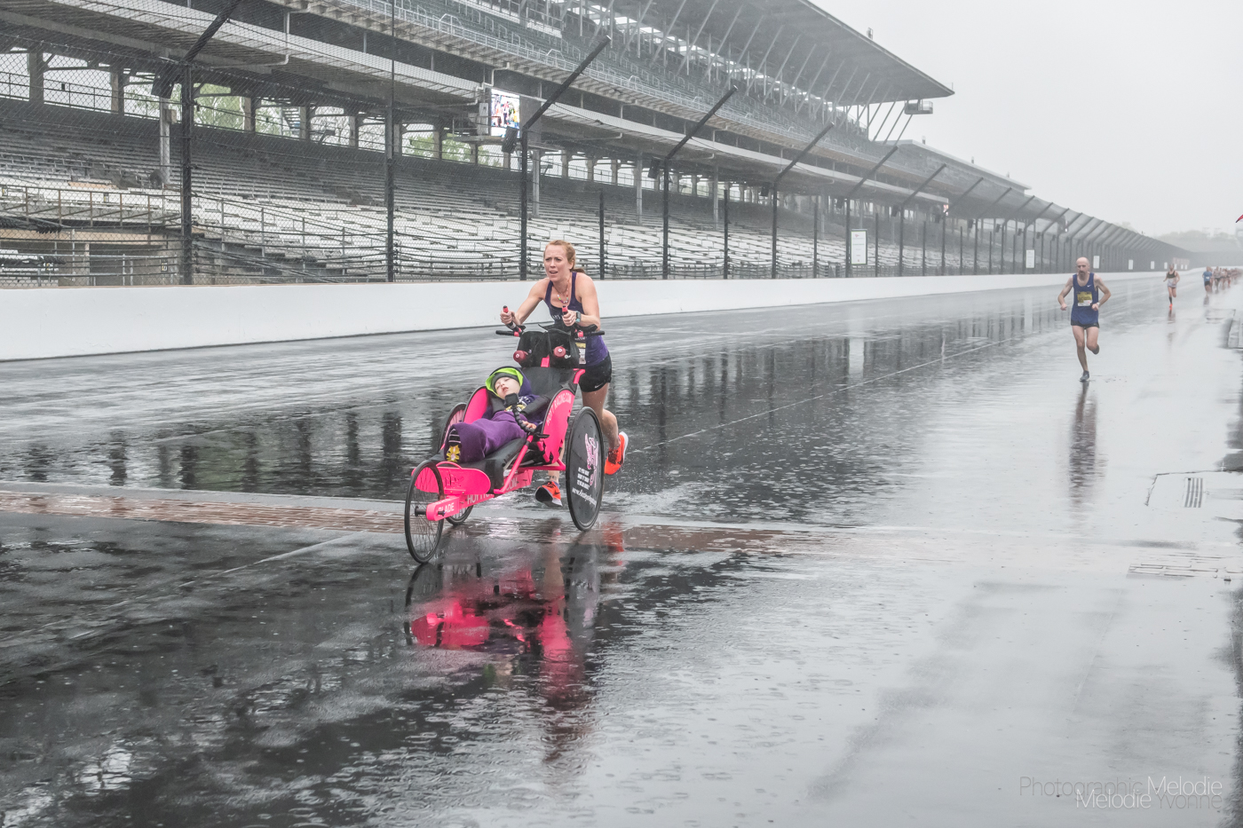 Participants enjoy their lap around the Indianapolis Motor Speedway despite the rain during the Annual OneAmerica 500 Festival Mini-Marathon on Saturday, May 4, 2019.