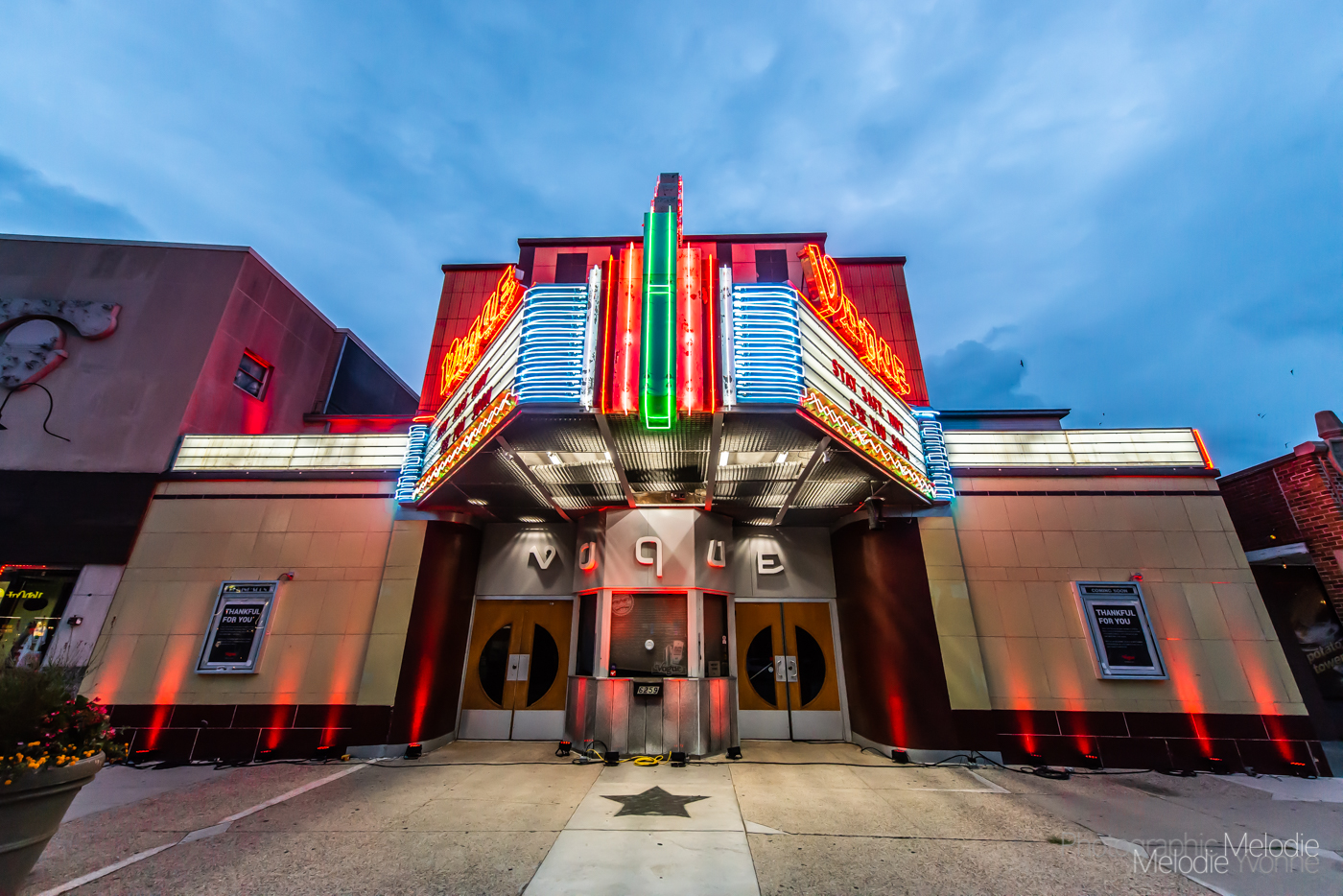 The Vogue Theatre is illuminated in red light as part of the #RedAlertRESTART Day of Action on Tuesday, September 1, 2020. Photo cred Melodie Yvonne