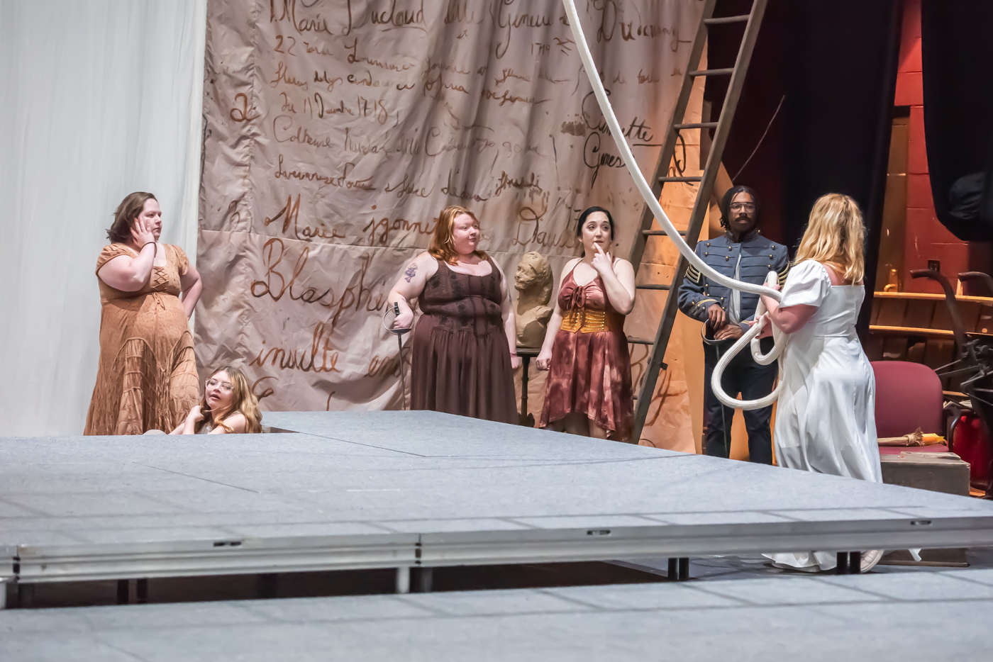 The cast and crew of locally written and produced “Just Beginning” by Laura Krell performing a dress rehearsal May 28, 2024, at the Franklin College Theatre in Franklin.