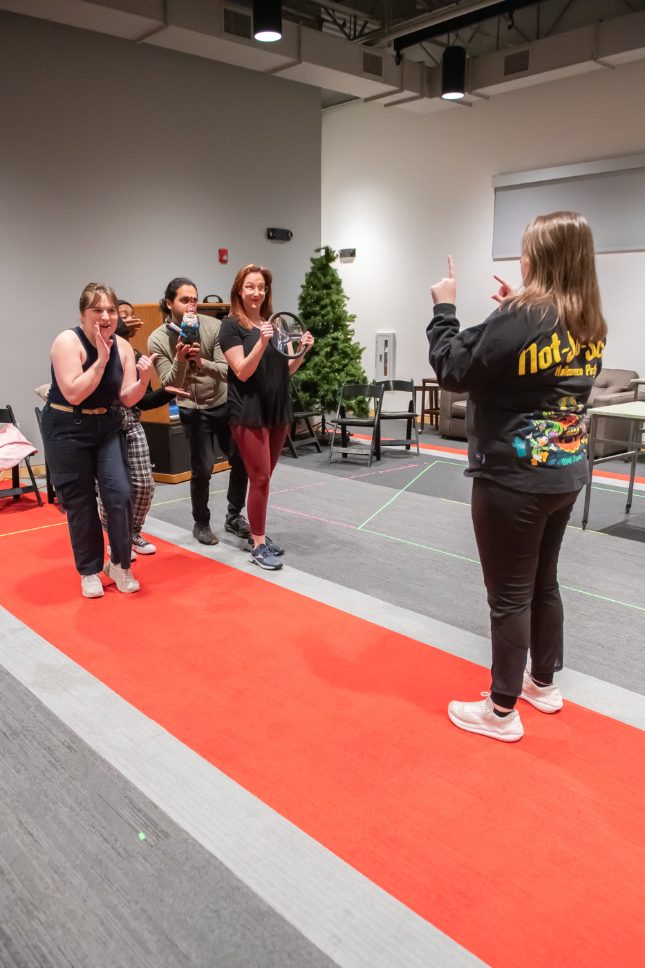 Director Zack Neiditch works with performers at a rehearsal for A Very Phoenix Xmas XVII: Sleigh, Queen, Sleigh! November 19, 2025, at the Phoenix Theatre in Indianapolis.