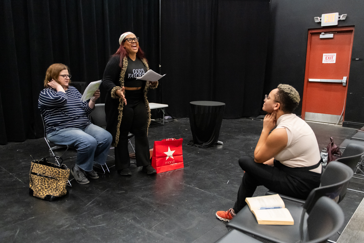 Performers Shannon Samson, cast as Woman in Black, and Tiana Edmond, cast as Woman in White, work with director Brandy Metzger during rehearsal of “Railing It Uptown” for FemmeFest March 4, 2026, at IF Theatre in Indianapolis.