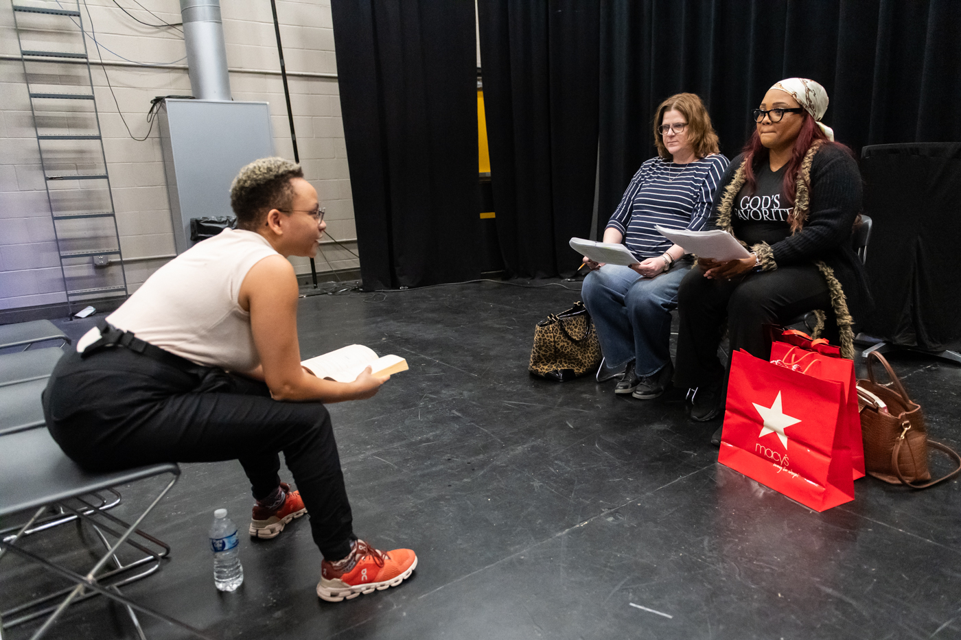 Performers Shannon Samson, cast as Woman in Black, and Tiana Edmond, cast as Woman in White, work with director Brandy Metzger during rehearsal of “Railing It Uptown” for FemmeFest March 4, 2026, at IF Theatre in Indianapolis.