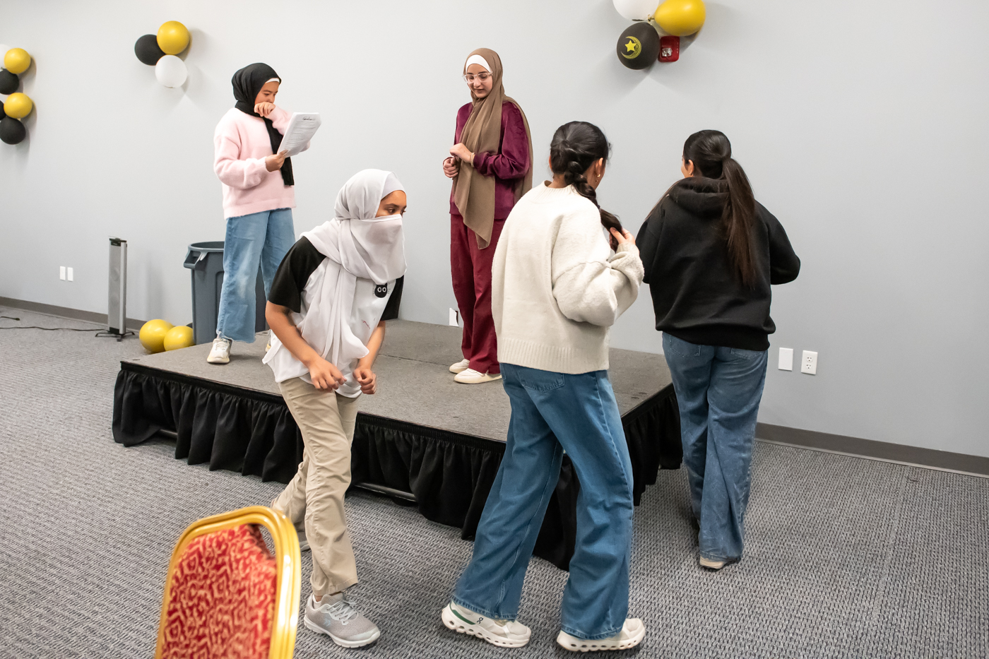 Performers run through a scene during the rehearsal for Lantern Islamic Theater Company’s production of “Coraline” March 28, 2026 at Visionary I in Fishers.