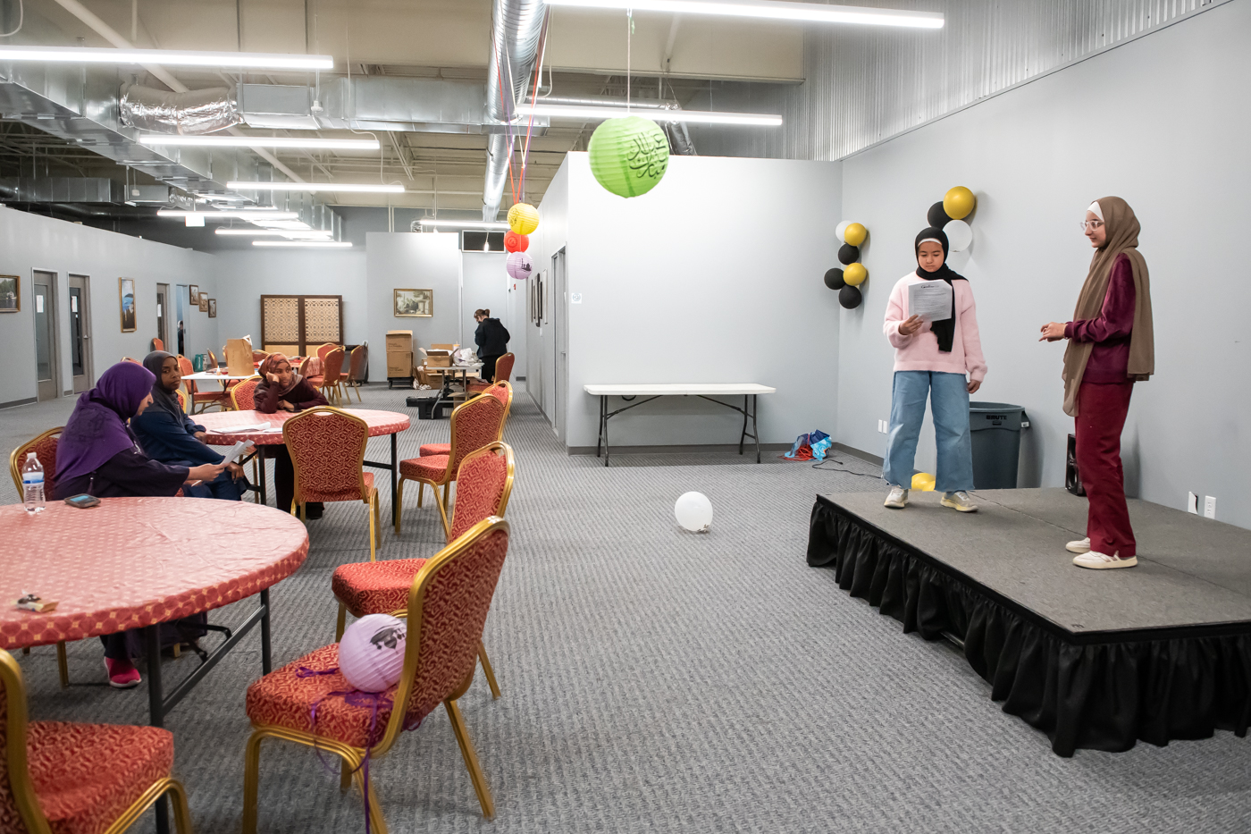 Performers Nuram Qeyam (left) and Alina Fahd (right) work on their lines with castmates during the rehearsal for Lantern Islamic Theater Company’s production of “Coraline” March 28, 2026 at Visionary I in Fishers.