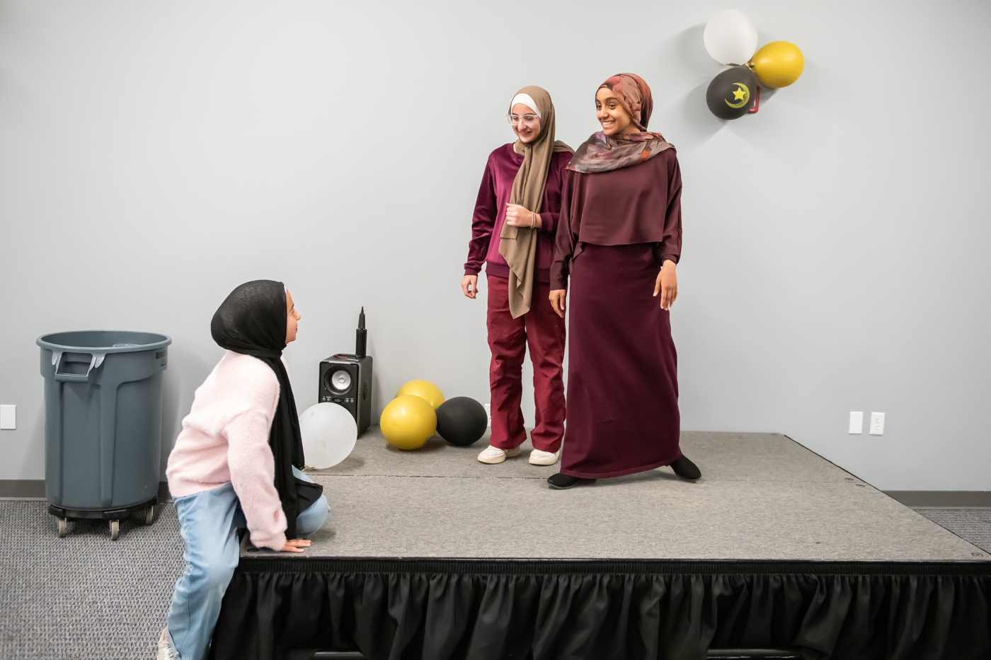 Performers Nuram Qeyam (left), Alina Fahd (center), and Wajiha Tamimi (right) work on their lines during the rehearsal for Lantern Islamic Theater Company’s production of “Coraline” March 28, 2026 at Visionary I in Fishers.