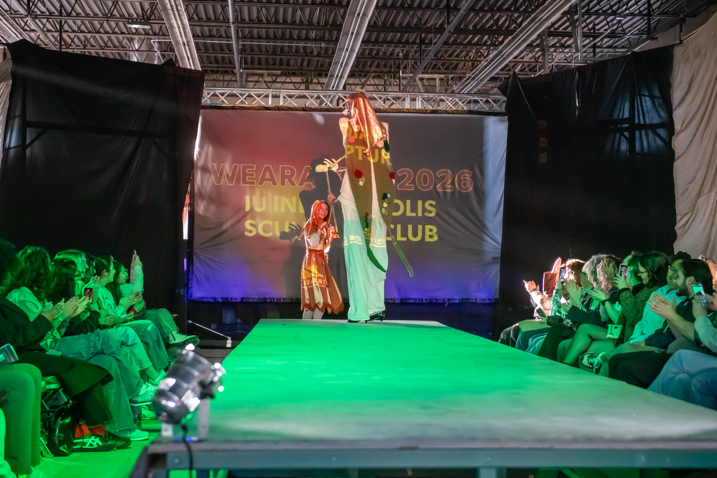 Lillian Swetnam (left) and Alistair Parry (right) walk the runway during the 22nd Annual Herron Sculpture Club Wearable Art show April 7, 2026, at the Sidney & Lois Eskenazi Fine Arts Center in Indianapolis.