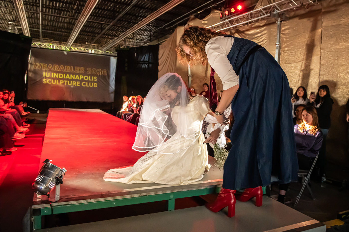 Clara Schuman assists Anna Buttler during a staged runway moment at the 22nd Annual Herron Sculpture Club Wearable Art show April 7, 2026, at the Sidney & Lois Eskenazi Fine Arts Center in Indianapolis.