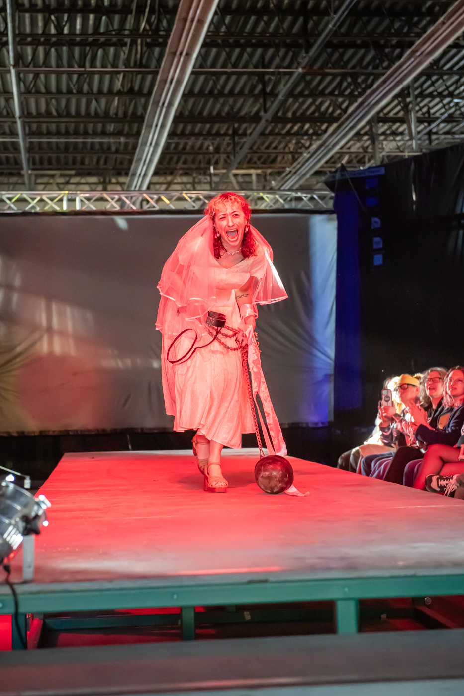 Anna Buttler poses at the end of the runway during the 22nd Annual Herron Sculpture Club Wearable Art show April 7, 2026, at the Sidney & Lois Eskenazi Fine Arts Center in Indianapolis.
