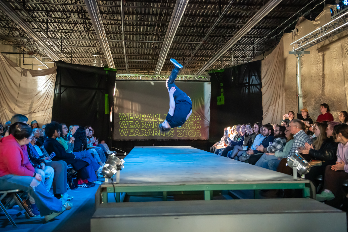 Obi Herold flips down the runway during the 22nd Annual Herron Sculpture Club Wearable Art show April 7, 2026, at the Sidney & Lois Eskenazi Fine Arts Center in Indianapolis.