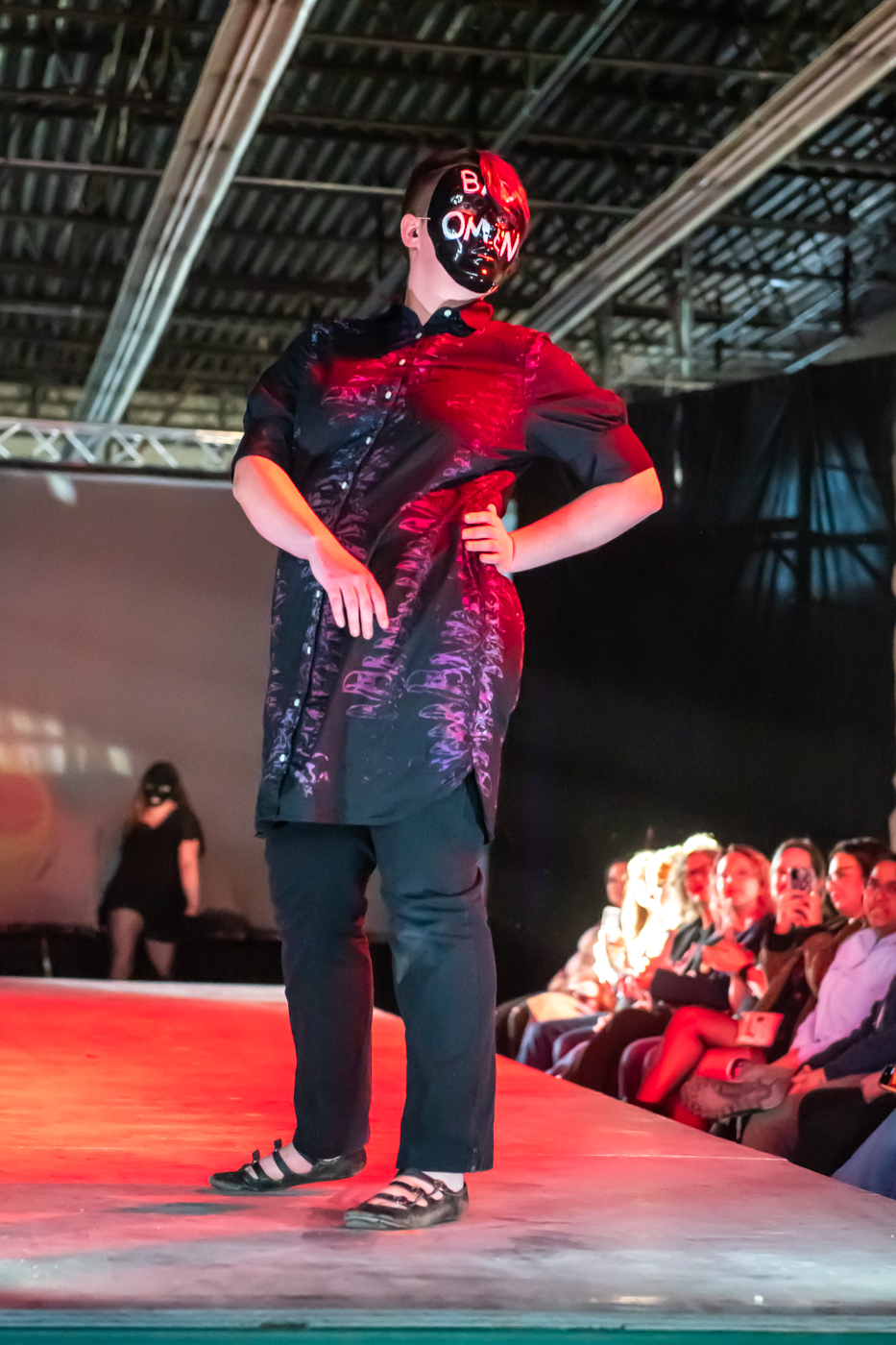 Geo Colvard poses on the runway during the 22nd Annual Herron Sculpture Club Wearable Art show April 7, 2026, at the Sidney & Lois Eskenazi Fine Arts Center in Indianapolis.