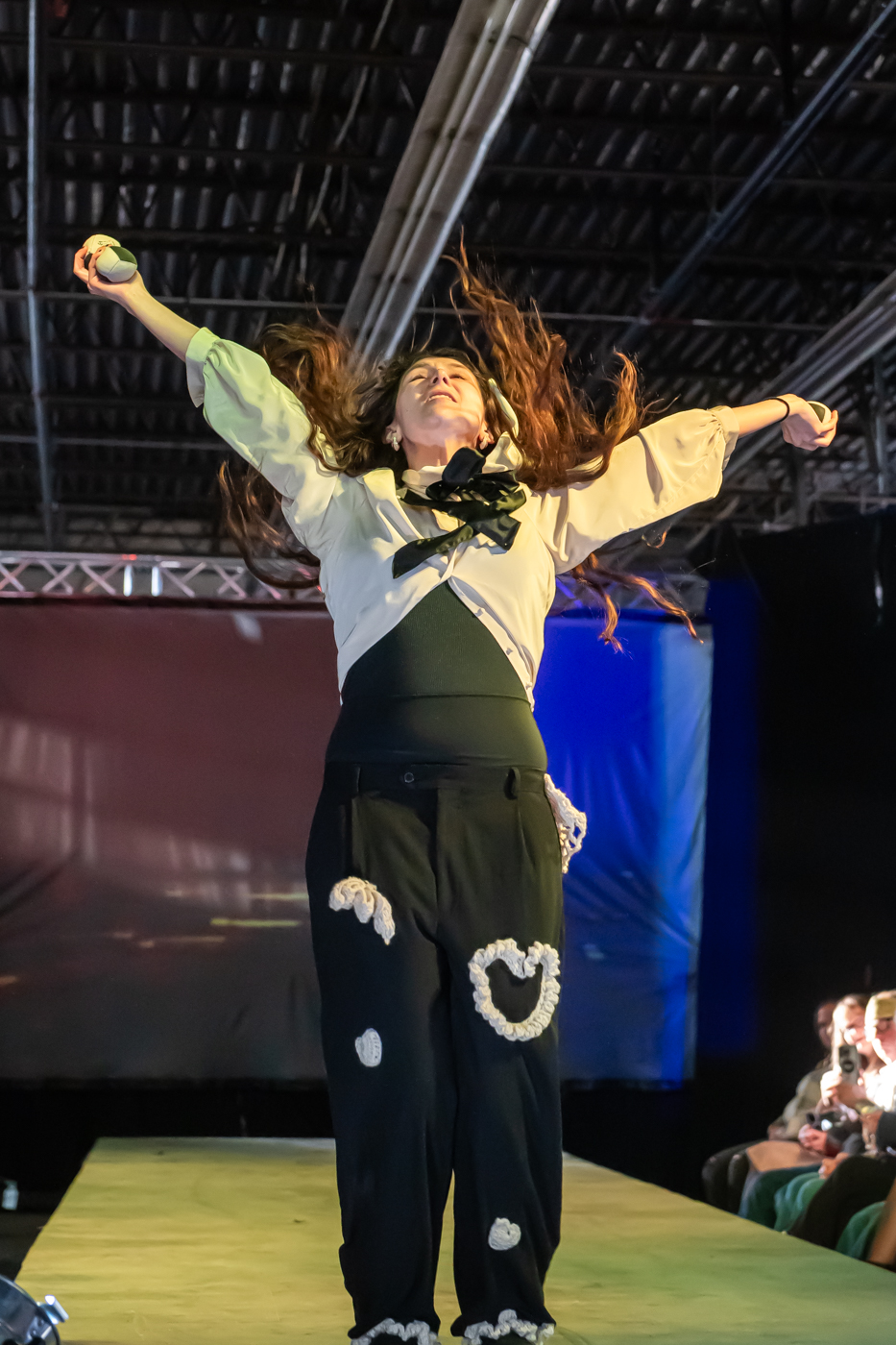 Mari Moore juggles down the runway during the 22nd Annual Herron Sculpture Club Wearable Art show April 7, 2026, at the Sidney & Lois Eskenazi Fine Arts Center in Indianapolis.