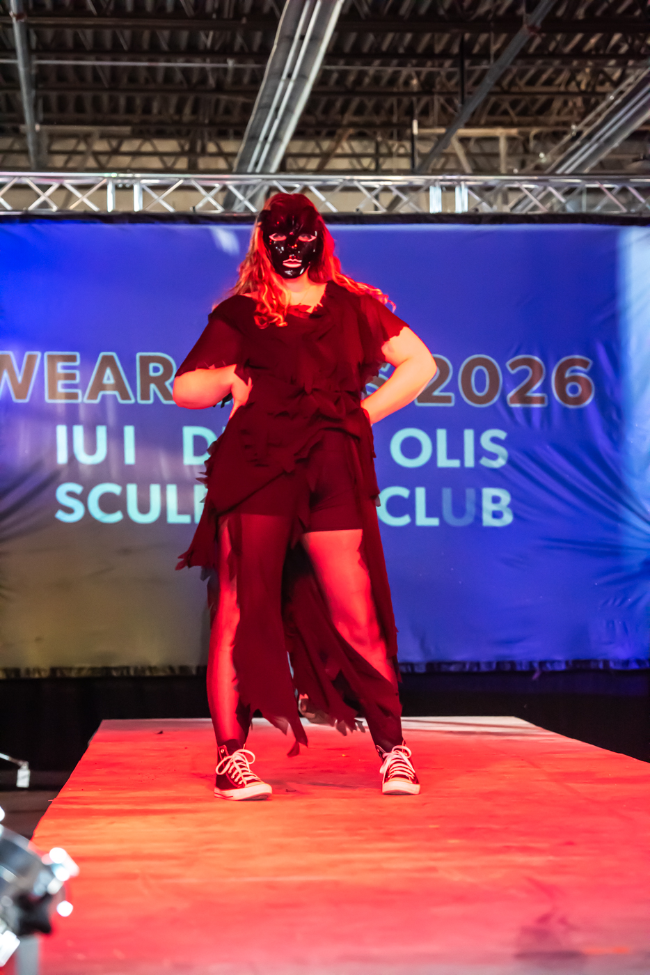 A model poses on the runway during the 22nd Annual Herron Sculpture Club Wearable Art show April 7, 2026, at the Sidney & Lois Eskenazi Fine Arts Center in Indianapolis.
